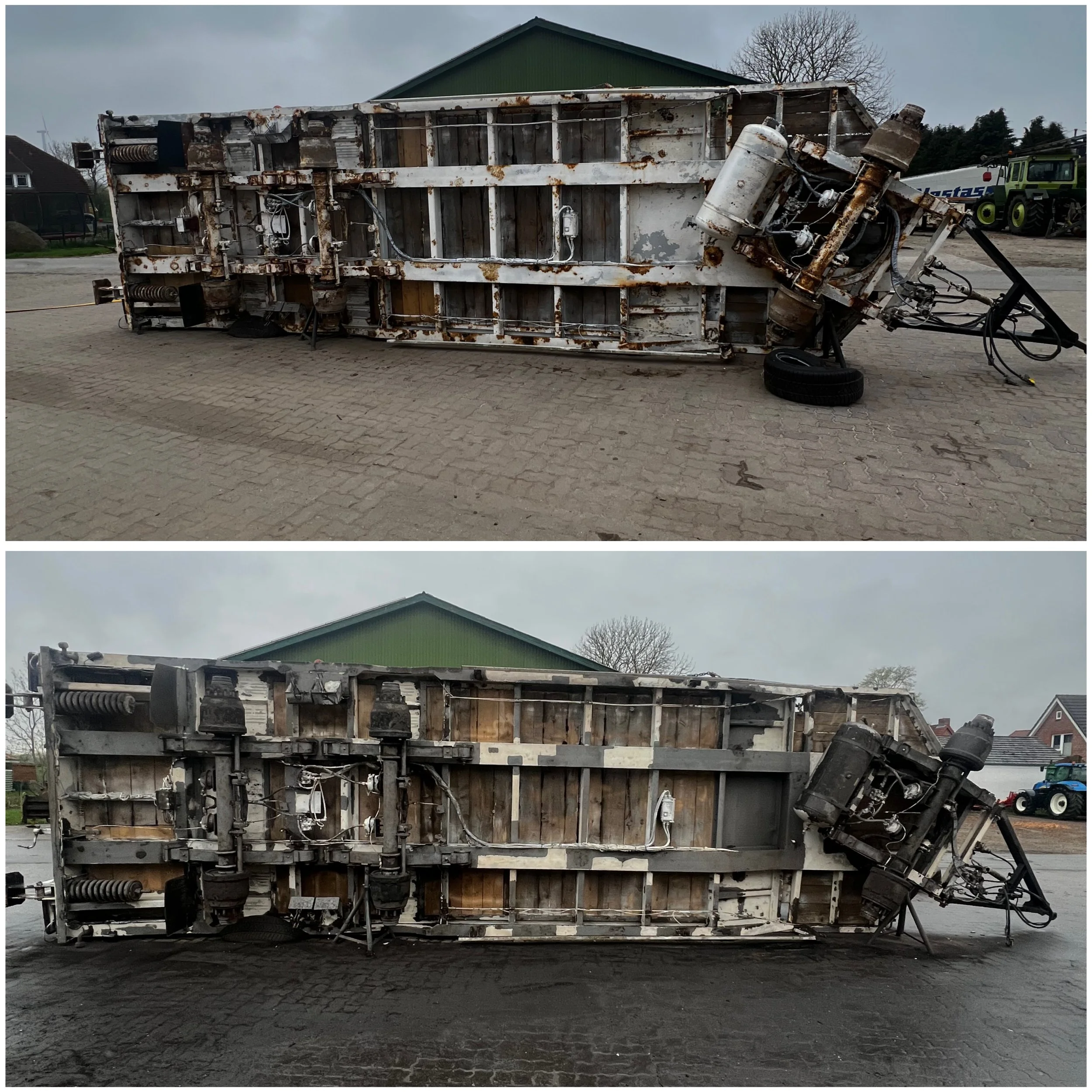 Ein alter, verrosteter Anhänger steht auf einem Grundstück, das an einem Holzhaus mit grünen Dach und Bäumen im Hintergrund liegt.