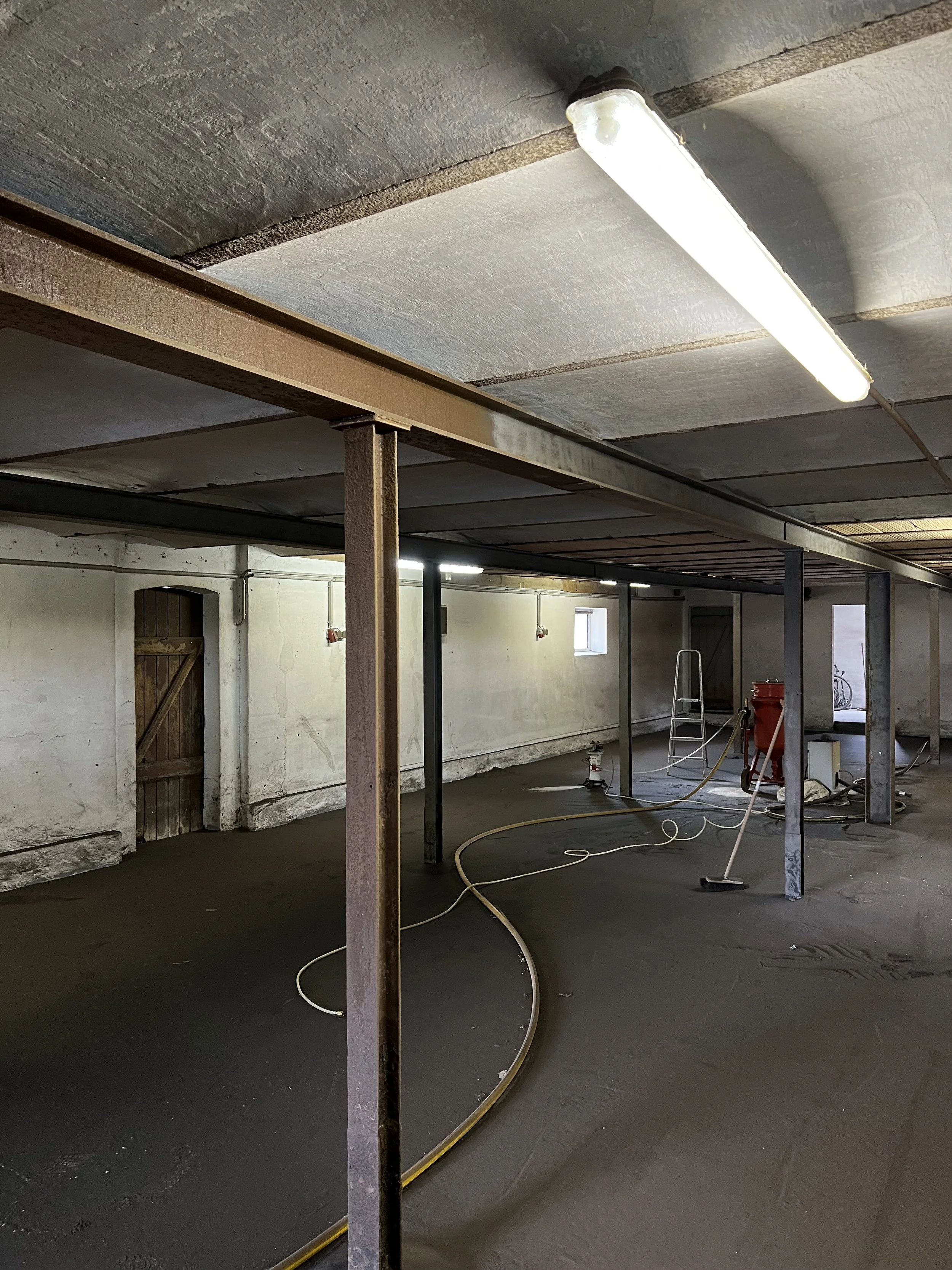Baustelle im Keller mit Stahlpfeilern, Verkabelung, Fliesenkellen, Leiter, Eimer, Putzmaschine, und Lichtquelle.