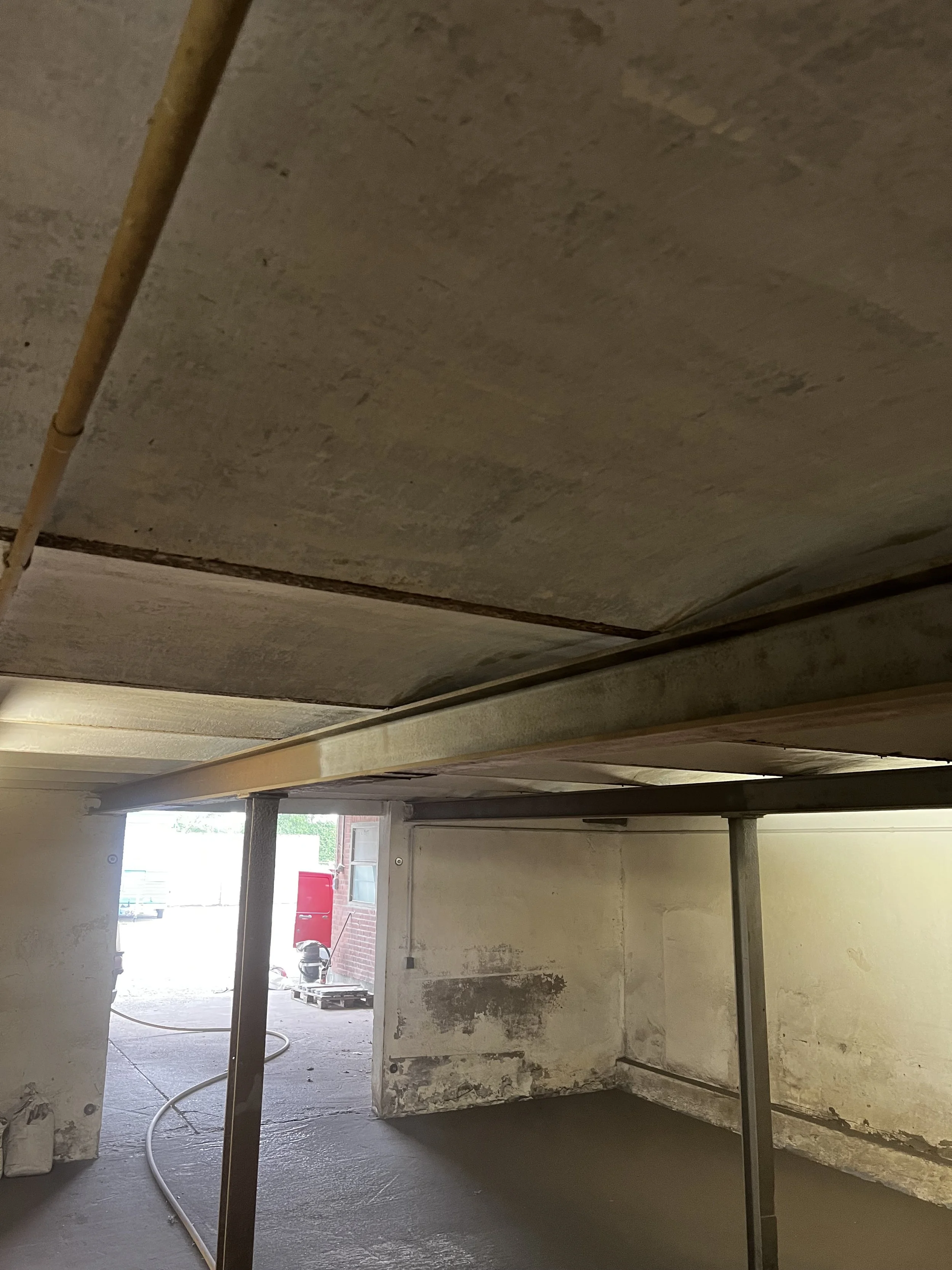 Innenraum einer renovierten, leerstehenden Garage mit Stahlstützen und abgetragenem Boden