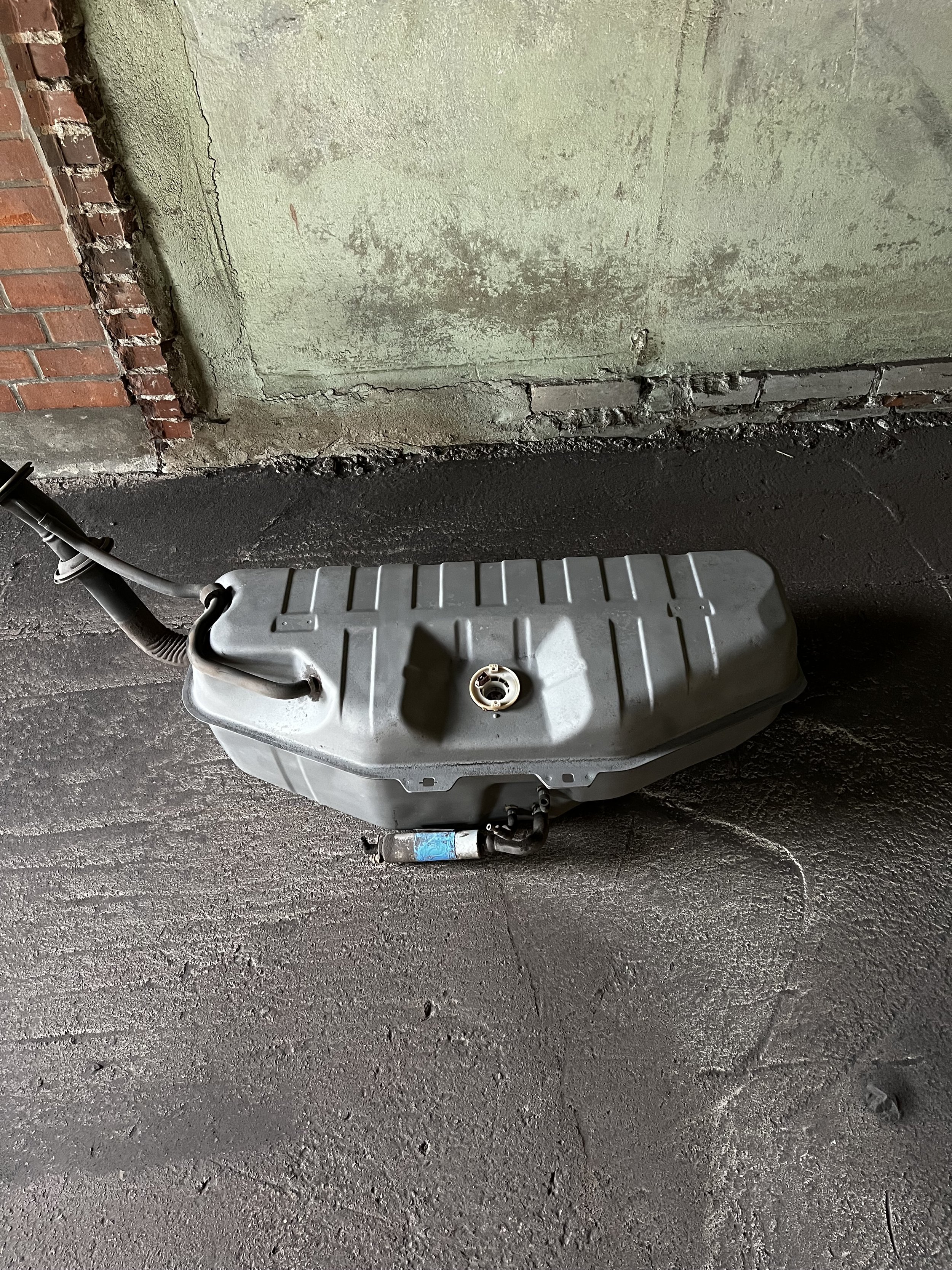 Ein Tank für Kraftstoff oder Flüssigkeiten liegt auf dem Boden in einem Raum, mit einer Wand im Hintergrund.